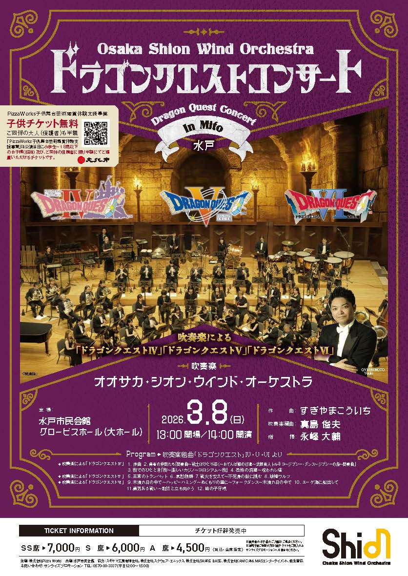 文化庁子供無料招待あり!2026.3.8(Sun)Osaka Shion Wind Orchestra ドラゴンクエストコンサート in水戸 吹奏楽による「ドラゴンクエスト」Ⅳ・Ⅴ・Ⅵ
